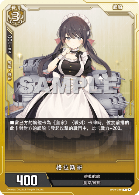 ?牌效果■當己方的旗艦?為《皇家》〈戰列〉?牌時,位於前排的此?對對方的艦船?發起攻?的戰鬥中,此?戰力+200。