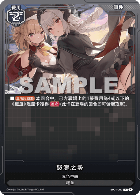 ?牌效果■【主階段?動】本回合中,己方戰場上的1張費用為4或以下的《鐵血》艦船?獲得【速攻】(此?在登場的回合即可發起攻?)。