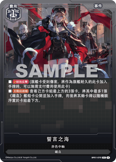 ?牌效果■【?地反?】(旗艦?受到傷害,將作為旗艦耐久的此?加入手牌時,可以無需支付費用使用此?)■【主階段?動】?看己方?組最上方的3張?,將其中最多1張《鐵血》艦船?公開並加入手牌,而後將其餘?牌以隨機順序置於?組最下方。