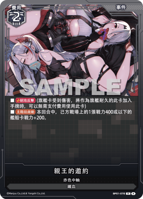 ?牌效果■【?地反?】(旗艦?受到傷害,將作為旗艦耐久的此?加入手牌時,可以無需支付費用使用此?)■【主階段?動】本回合中,己方戰場上的1張戰力400或以下的艦船?戰力+200。