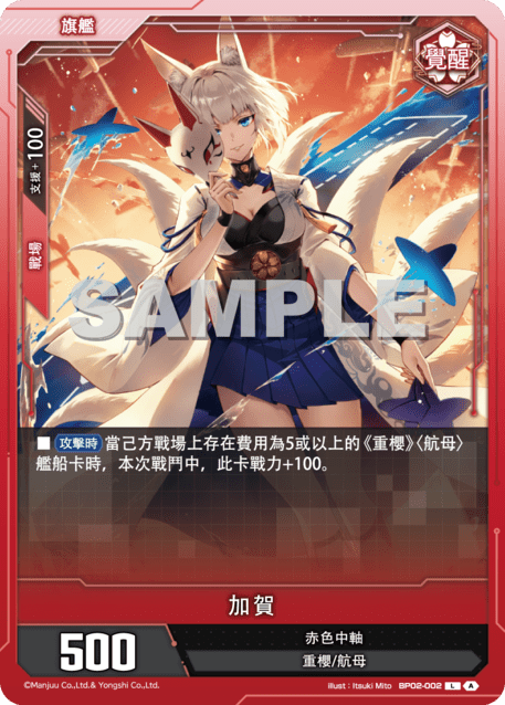 ?牌效果■【攻?時】當己方戰場上存在費用為5或以上的《重櫻》〈航母〉艦船?時,本次戰鬥中,此?戰力+100。