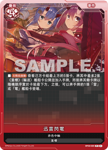 ?牌效果■【主階段?動】?看己方?組最上方的5張?,將其中最多2張《重櫻》〈驅逐〉艦船?公開並加入手牌,而後將其餘?牌以隨機順序置於?組最下方。之後,可以將手牌的1張「雷」或「電」艦船?登場。