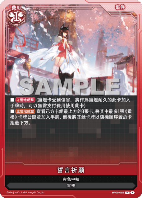 ?牌效果■【?地反?】(旗艦?受到傷害,將作為旗艦耐久的此?加入手牌時,可以無需支付費用使用此?)■【主階段?動】?看己方?組最上方的3張?,將其中最多1張《重櫻》?牌公開並加入手牌,而後將其餘?牌以隨機順序置於?組最下方。