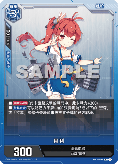 ?牌效果■【強?+200】(此?發起攻?的戰鬥中,此?戰力+200)■【被?破時】可以將己方手牌中的1張費用為3或以下的「班森」或「拉菲」艦船?登場於未被放置?牌的己方戰場。
