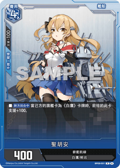 ?牌效果■【對方回合中】當己方的旗艦?為《白鷹》?牌時,前排的此?支援+100。