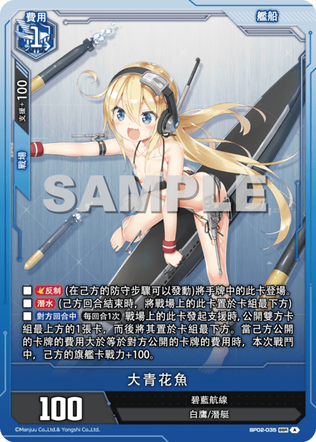 ?牌效果■【反制】(在己方的防守?驟可以發動)將手牌中的此?登場。■【潛水】(己方回合結束時,將戰場上的此?置於?組最下方)■【對方回合中】【?回合1次】戰場上的此?發起支援時,公開雙方?組最上方的1張?,而後將其置於?組最下方。當己方公開的?牌的費用大於等於對方公開的?牌的費用時,本次戰鬥中,己方的旗艦?戰力+100。