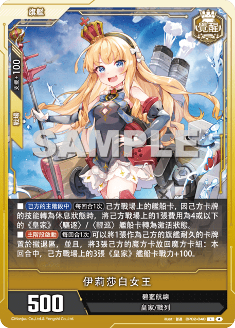 ?牌效果■【己方的主階段中】【?回合1次】己方戰場上的艦船?,因己方?牌的技能轉為休息?態時,將己方戰場上的1張費用為4或以下的《皇家》〈驅逐〉/〈輕巡〉艦船?轉為激活?態。■【主階段?動】【?回合1次】將1張作為己方的旗艦耐久的?牌置於撤退區,並且,將3張己方的魔方?放回魔方?組:本回合中,己方戰場上的3張《皇家》艦船?戰力+100。