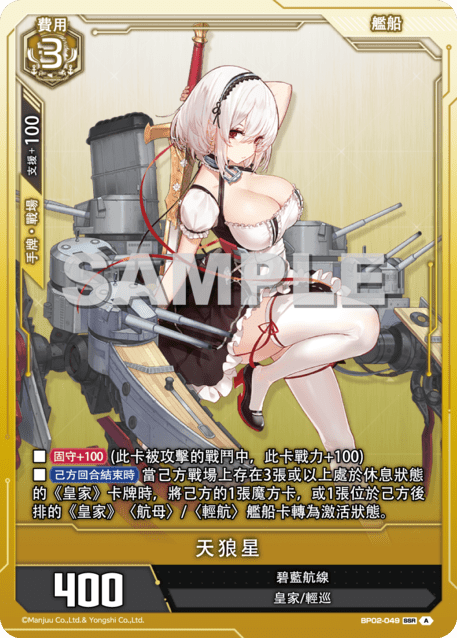 ?牌效果■【固守+100】(此?被攻?的戰鬥中,此?戰力+100)■【己方回合結束時】當己方戰場上存在3張或以上處於休息?態的《皇家》?牌時,將己方的1張魔方?,或1張位於己方後排的《皇家》〈航母〉/〈輕航〉艦船?轉為激活?態。