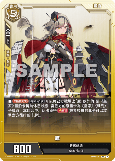 ?牌效果■【主階段?動】【?回合1次】可以將己方戰場上「鷹」以外的1張《皇家》艦船?轉為休息?態:當己方的旗艦?為《皇家》〈戰列〉?牌時,本回合中,此?獲得【遠程】(位於後排的此?可以攻?對方後排的?牌)。