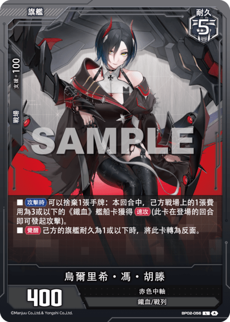 ?牌效果■【攻撃時】可以捨棄1張手牌:本回合中,己方戰場上的1張費用為3或以下的《鐵血》艦船?獲得【速攻】(此?在登場的回合即可發起攻?)。■【覺醒】己方的旗艦耐久為1或以下時,將此?轉為反面。