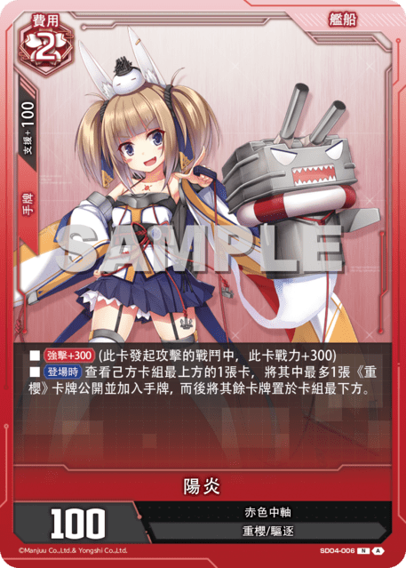 ?牌效果■【強?+300】(此?發起攻?的戰鬥中,此?戰力+300)■【登場時】?看己方?組最上方的1張?,將其中最多1張《重櫻》?牌公開並加入手牌,而後將其餘?牌置於?組最下方。