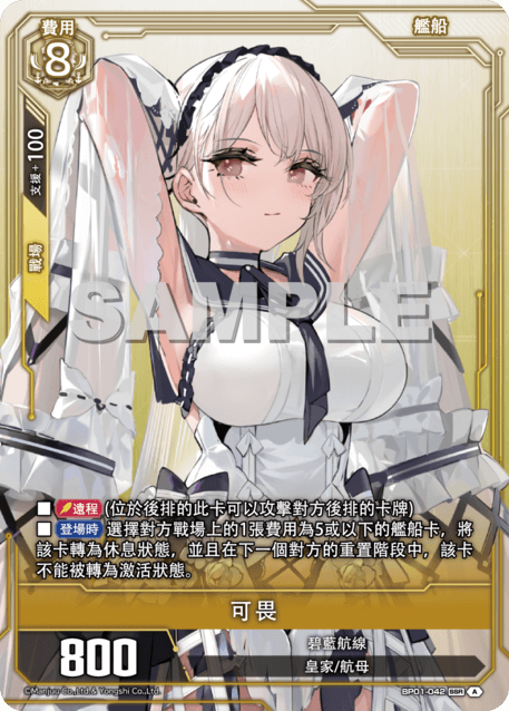 ?牌效果■【遠程】(位於後排的此?可以攻?對方後排的?牌)■【登場時】選擇對方戰場上的1張費用為5或以下的艦船?,將該?轉為休息?態,並且在下一個對方的重置階段中,該?不能被轉為激活?態。