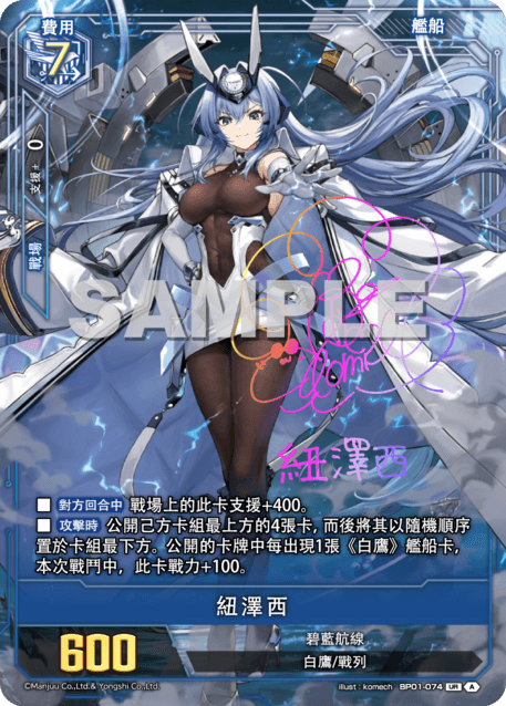 ?牌效果■【對方回合中】戰場上的此?支援+400。■【攻?時】公開己方?組最上方的4張?,而後將其以隨機順序置於?組最下方。公開的?牌中?出現1張《白鷹》艦船?,本次戰鬥中,此?戰力+100。