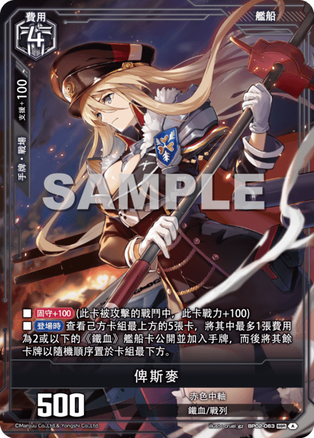 ?牌效果■【固守+100】(此?被攻?的戰鬥中,此?戰力+100)■【登場時】?看己方?組最上方的5張?,將其中最多1張費用為2或以下的《鐵血》艦船?公開並加入手牌,而後將其餘?牌以隨機順序置於?組最下方。