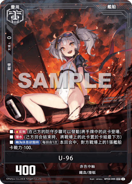 ?牌效果■【反制】(在己方的防守?驟可以發動)將手牌中的此?登場。■【潛水】(己方回合結束時,將戰場上的此?置於?組最下方)■【轉為休息?態時】【?回合1次】本回合中,對方戰場上的1張艦船?戰力-100。