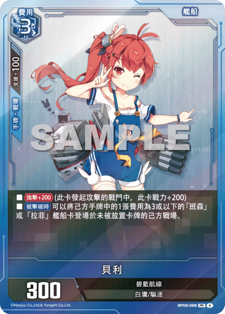 ?牌效果【強?+200】(此?發起攻?的戰鬥中,此?戰力+200)【被?破時】可以將己方手牌中的1張費用為3或以下的「班森」或「拉菲」艦船?登場於未被放置?牌的己方戰場。