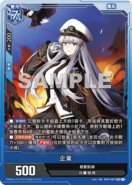 ?牌效果■【登場時】公開對方?組最上方的1張?,而後將其置於對方?組最下方。當公開的?牌費用小於7時,將對方戰場上的1張費用為4或以下的艦船?彈回?組最下方。■【主階段?動】【?回合1次】可以捨棄3張手牌:本回合中,此?戰力+500,獲得【遠程】(位於後排的此?可以攻?對方後排的?牌)。