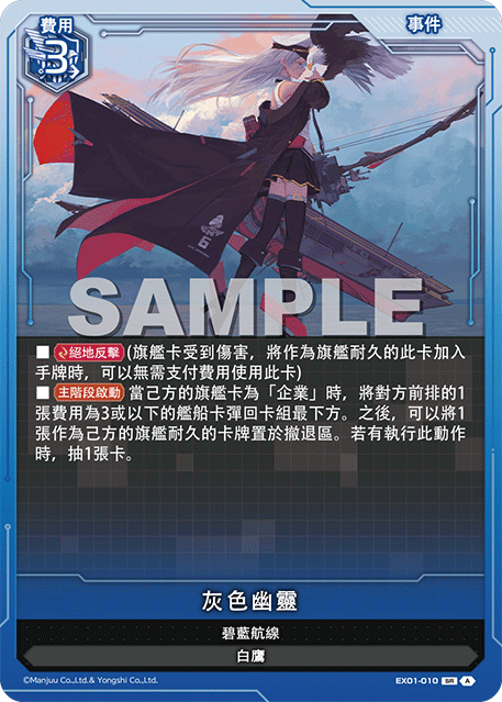 ?牌效果■【?地反?】(旗艦?受到傷害,將作為旗艦耐久的此?加入手牌時,可以無需支付費用使用此?)■【主階段?動】當己方的旗艦?為「企業」時,將對方前排的1張費用為3或以下的艦船?彈回?組最下方。之後,可以將1張作為己方的旗艦耐久的?牌置於撤退區。若有執行此動作時,抽1張?。