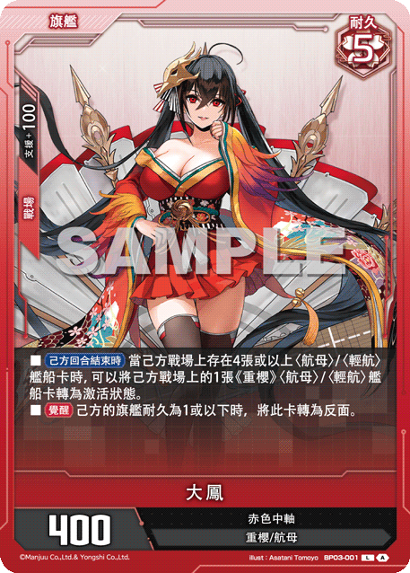 ?牌效果■【己方回合結束時】當己方戰場上存在4張或以上〈航母〉/〈輕航〉艦船?時,可以將己方戰場上的1張《重櫻》〈航母〉/〈輕航〉艦船?轉為激活?態。■【覺醒】己方的旗艦耐久為1或以下時,將此?轉為反面。