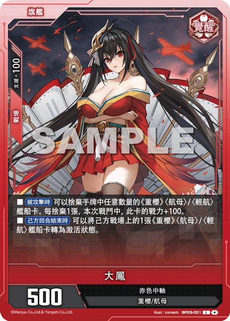 ?牌效果■【被攻?時】可以捨棄手牌中任意數量的《重櫻》〈航母〉/〈輕航〉艦船?。?捨棄1張,本次戰鬥中,此?的戰力+100。■【己方回合結束時】可以將己方戰場上的1張《重櫻》〈航母〉/〈輕航〉艦船?轉為激活?態。