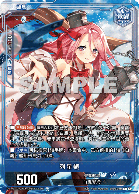 ?牌效果■【主階段?動】【?回合1次】將己方?組最上方的1張?公開。當該?為費用為3或以上的《白鷹》艦船?時,可以支付相應費用,將該?登場。若未將該?登場時,將該?置於?組的最上方或最下方。■【攻撃時】可以捨棄1張手牌:本回合中,己方前排的1張《白鷹》艦船?戰力+100。