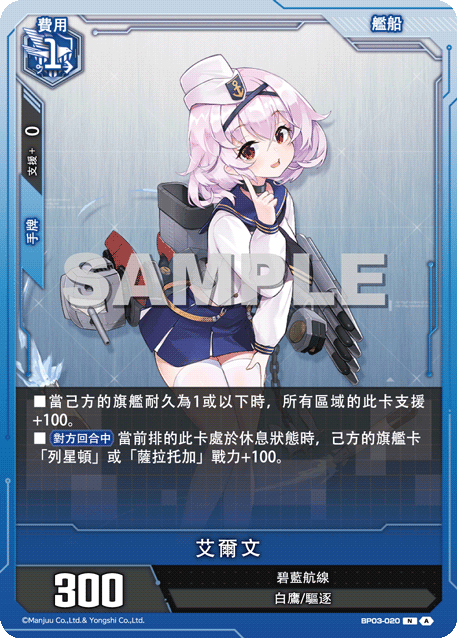 ?牌效果■當己方的旗艦耐久為1或以下時,所有區域的此?支援+100。■【對方回合中】當前排的此?處於休息?態時,己方的旗艦?「列星頓」或「薩拉托加」戰力+100。