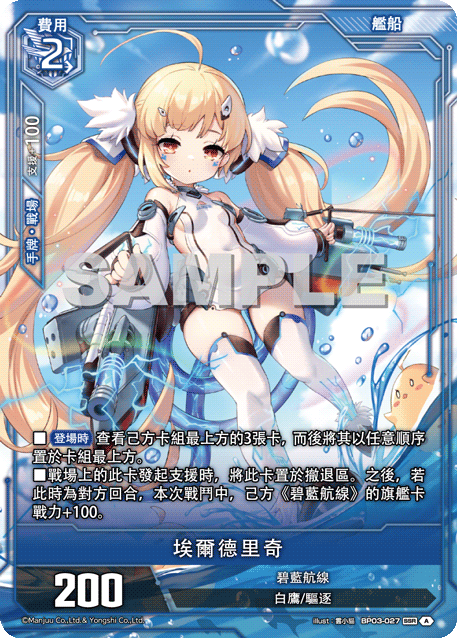 ?牌效果■【登場時】?看己方?組最上方的3張?,而後將其以任意順序置於?組最上方。■戰場上的此?發起支援時,將此?置於撤退區。之後,若此時為對方回合,本次戰鬥中,己方《碧藍航線》的旗艦?戰力+100。
