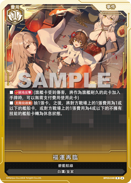 ?牌效果■【?地反?】(旗艦?受到傷害,將作為旗艦耐久的此?加入手牌時,可以無需支付費用使用此?)■【主階段?動】抽1張?。之後,將對方戰場上的1張費用為1或以下的艦船?,或對方戰場上的1張費用為4或以下的不擁有技能的艦船?轉為休息?態。