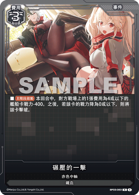 ?牌效果■【主階段?動】本回合中,對方戰場上的1張費用為4或以下的艦船?戰力-400。之後,若該?的戰力降為0或以下,則將該??破。